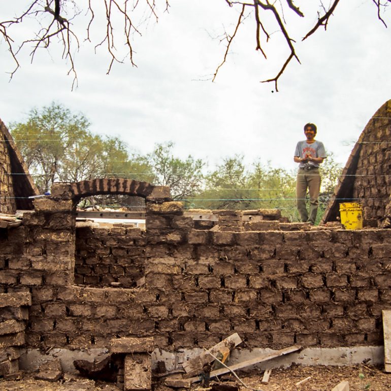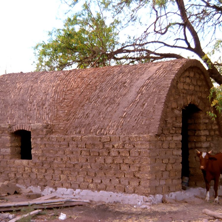As part of our no-concrete or wood roof exploration, we built a Nubian vault out of straw/clay blocks. The vault shape follows a catanary arch. The larger rectangular space that was afforded by the vault, made it more attractive than the dome interior that had to be square. It was constructed in the outskirts of Obregon in an area known as Xochitl, where the “Casas que Cantan” project took place.