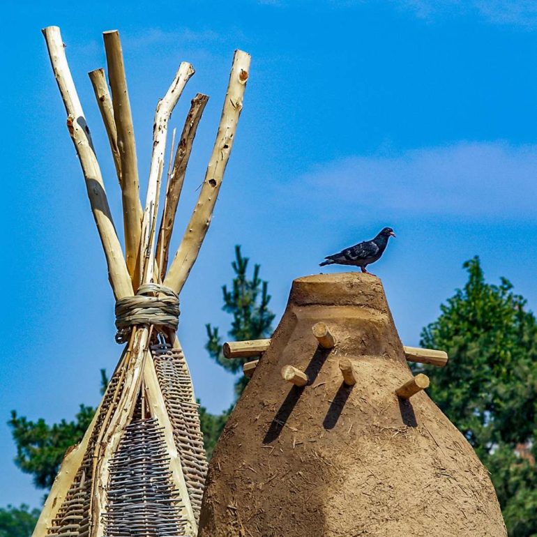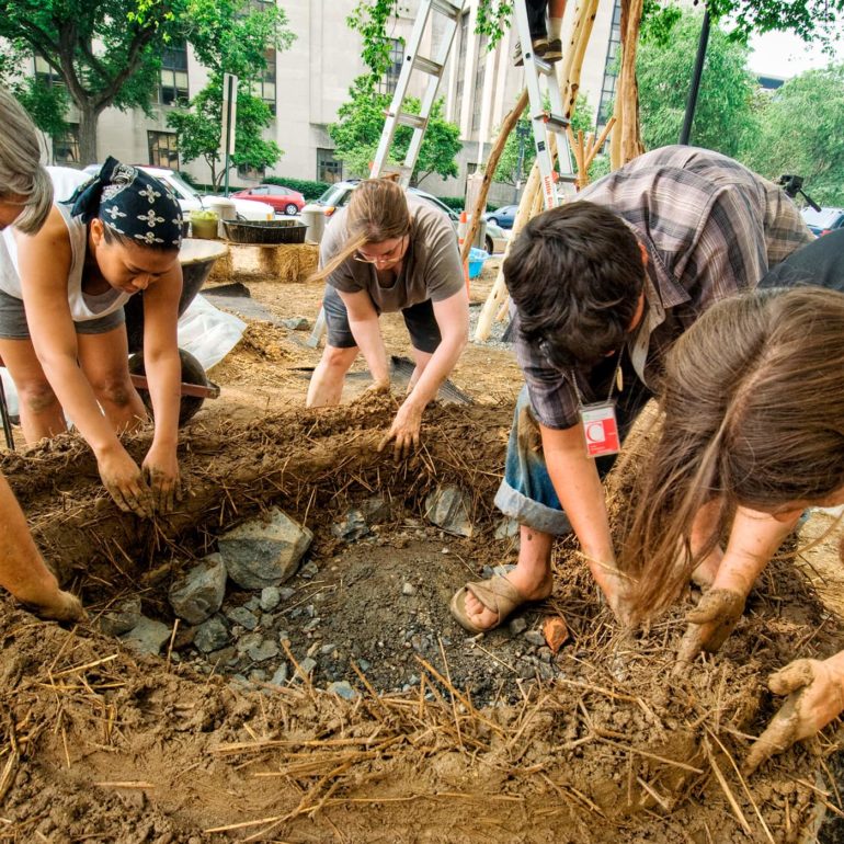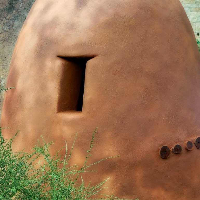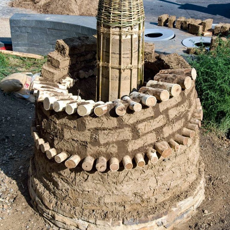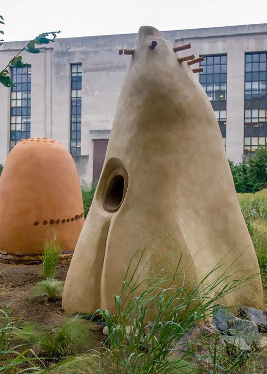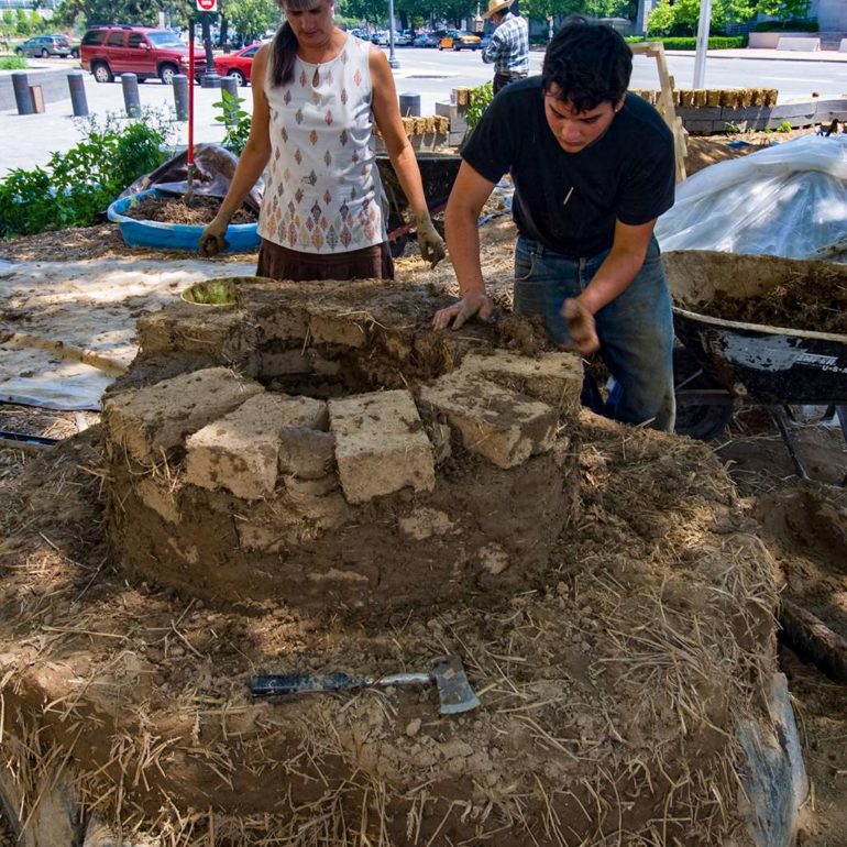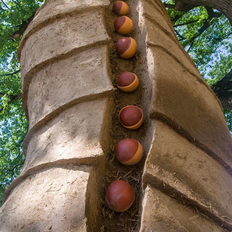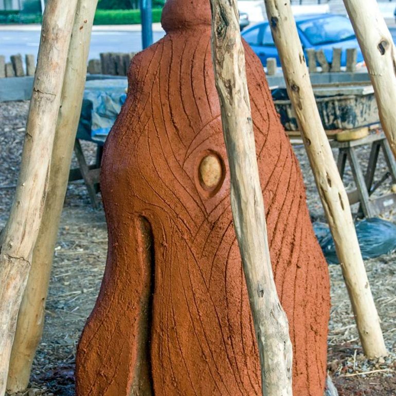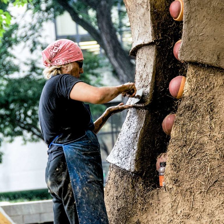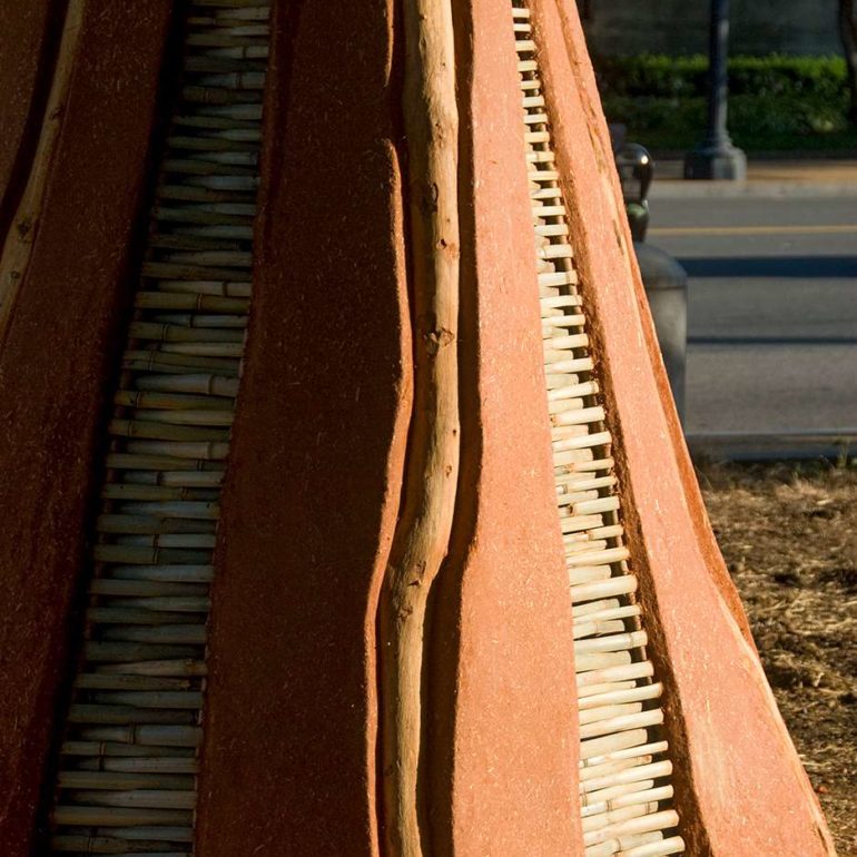 The project entitled, Always Becoming, consisted of five tower-like forms ranging in height from 8 to 15 feet, created out of local natural materials— clay soil, straw, sand, stone, wood poles, bamboo, reeds and plants.  Pueblo pottery carving designs and low-fired shards were also incorporated into the structures. The central idea for the exhibition was that the pieces would be ephemeral in nature, and allowed to weather away gradually over time.  In essence, the sculptures would take on a life of their own and would continually be in a process of Always Becoming.