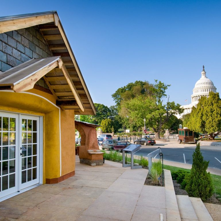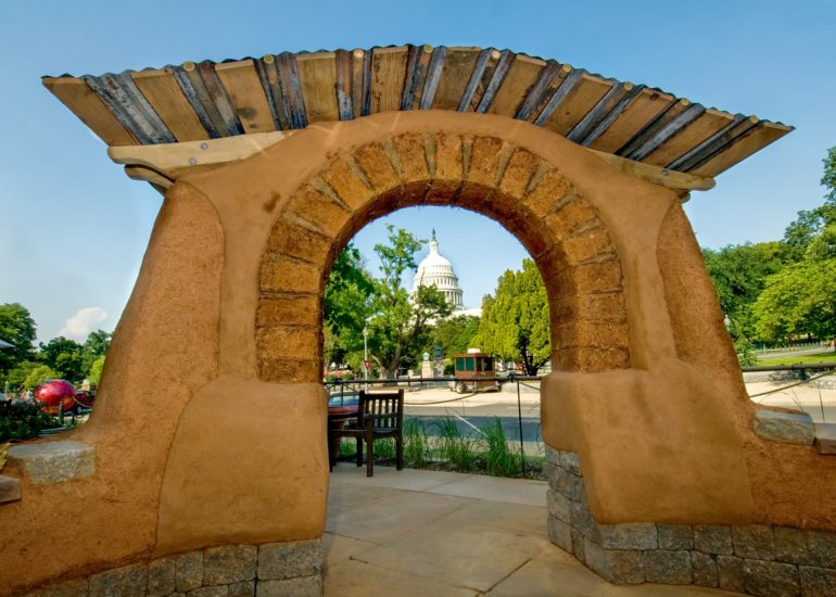 An exhibition at the Botanic Garden, that is located across the street from the U.S. Capitol, was called “One Planet – Ours!” It showcased a variety of sustainable techniques including edible school yards, urban orchards, a solar greenhouse, photovoltaic panels, residential wind turbines, green roofs and rainwater harvesting.