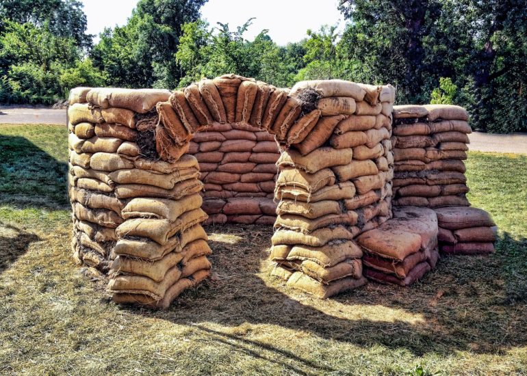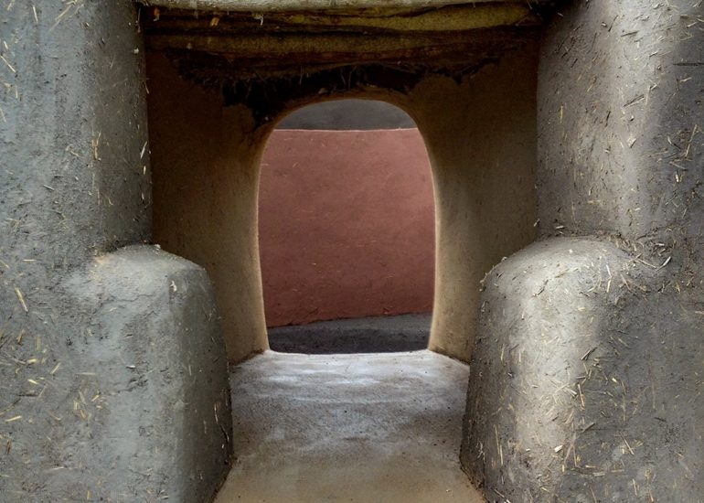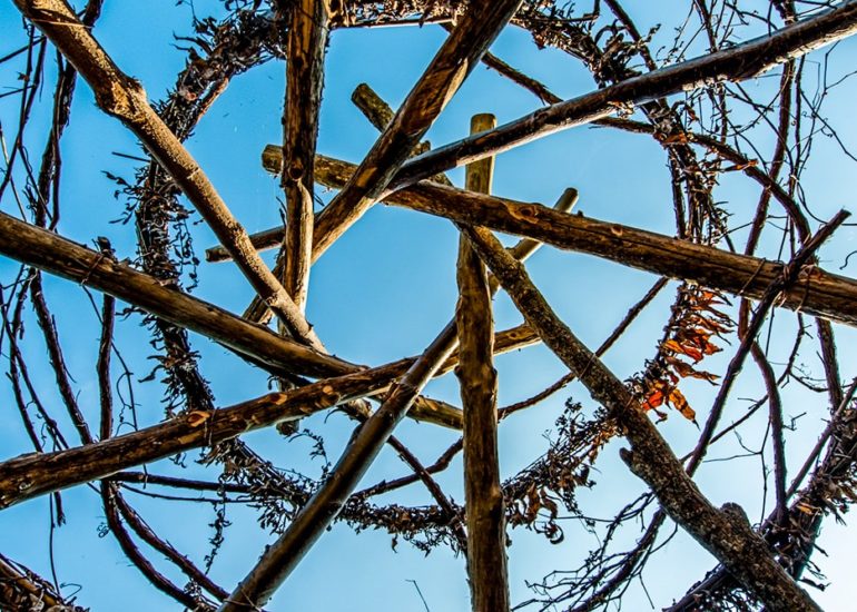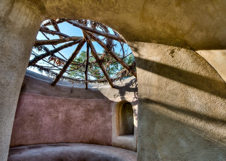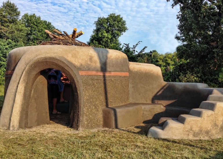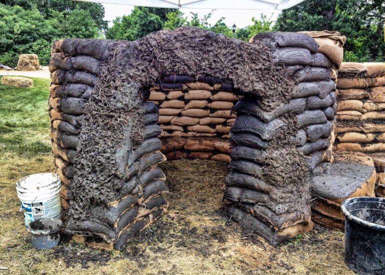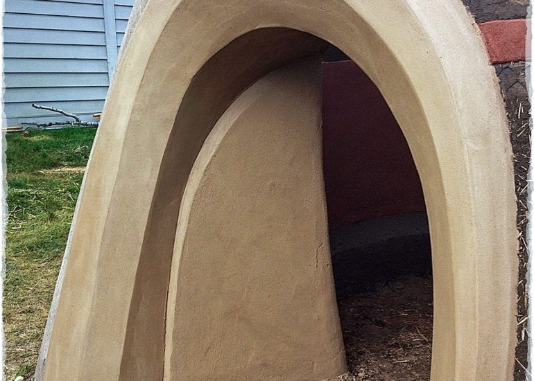 Our particular project was called the “Clayhouse,” a small round structure out of dirt-filled burlap bags plastered inside and out with clay from a brick factory (like our Denver Art Museum Clayground project.)  With poles and vines cut on Arboretum grounds we did a reciprocal roof