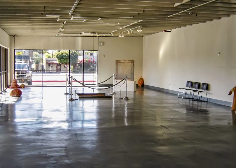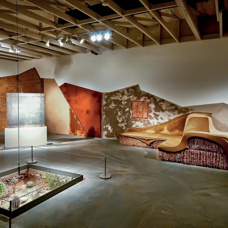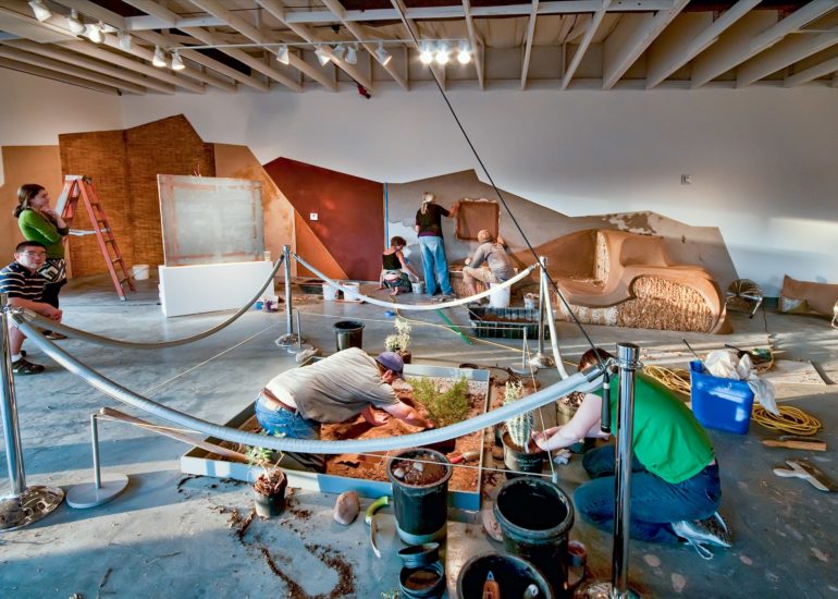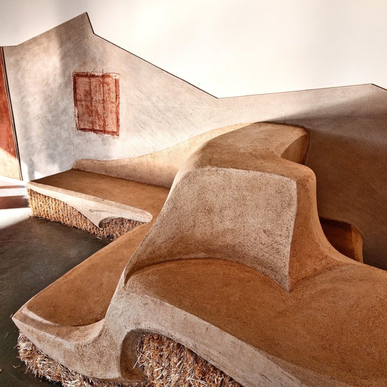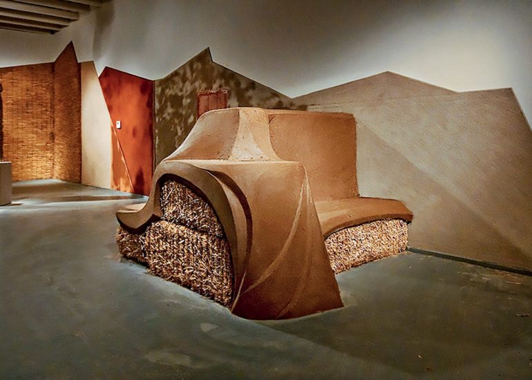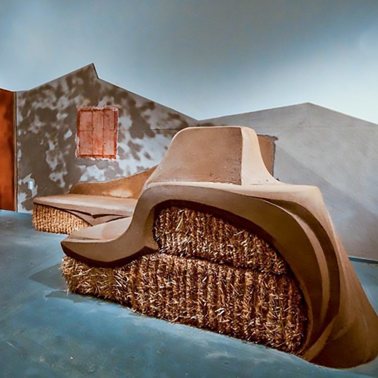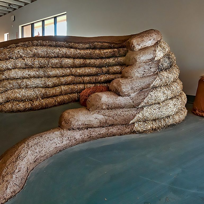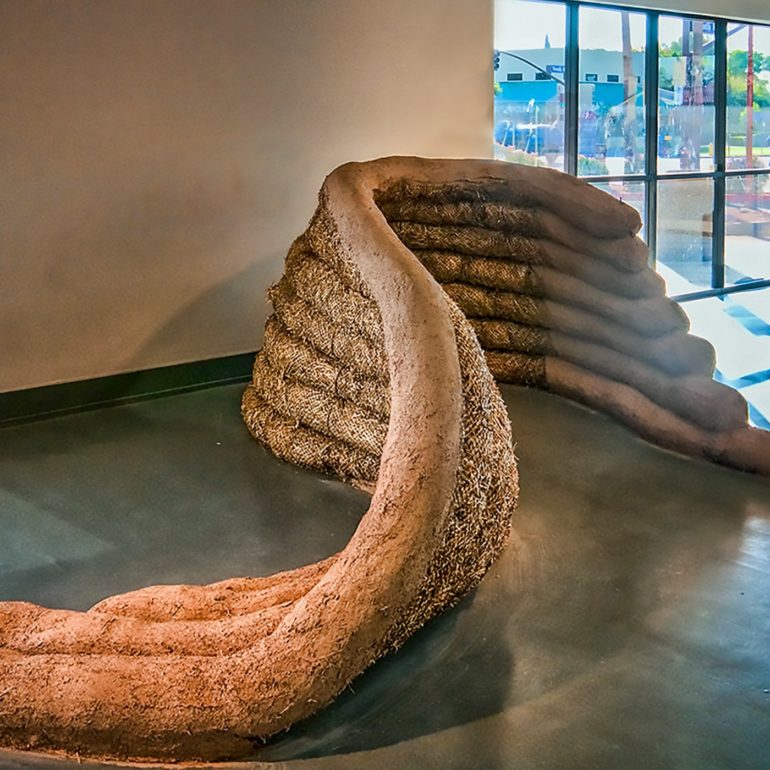Without much of a plan we lined up the materials – clay, chopped straw, bamboo poles, reed mats, straw bales and a new element we had not used before -straw wattles (typically used for erosion control.)  We began by creating a backdrop for the concrete piece and the pods by plastering creative shapes on the existing walls.  We sculpted a straw bale bench to provide seating for visitors along with a sculpture out of the wattles that was just inside the entrance.  We also brought in our friends Joe and Rebecca Ewan, professors of Landscape Architecture at ASU, to landscape the barren space left by removing the concrete from the floor.  More in-depth descriptions of the exhibition can be found at these pair of blog posts.
