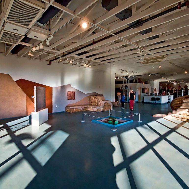 Post Commodity began the project by cutting a 4×4 ft hole in the concrete floor of the museum and stood it upright on a pedestal.  There was an audio recording of a Pee Posh social dance performed by the collective.  Never meeting any members of the group or discussing with them anything about the meaning of what they had done, we assumed it implied getting back to the earth.  Nora and her group had created a series of clay and fabric sculptures called “Pods,” that contained seeds to imply growth.