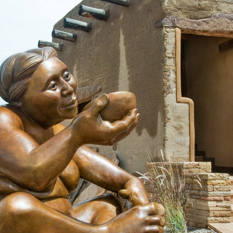 Roxanne Swentzell, Athena Steen’s sister, is internationally known for her clay sculptures and limited bronze editions. Her work is extensively exhibited in museums and galleries around the world. In August, 2006, after years of exhibiting her work elsewhere, she opened her own gallery at the Poeh Center of Pojoaque Pueblo, New Mexico (eight miles north of Santa Fe).